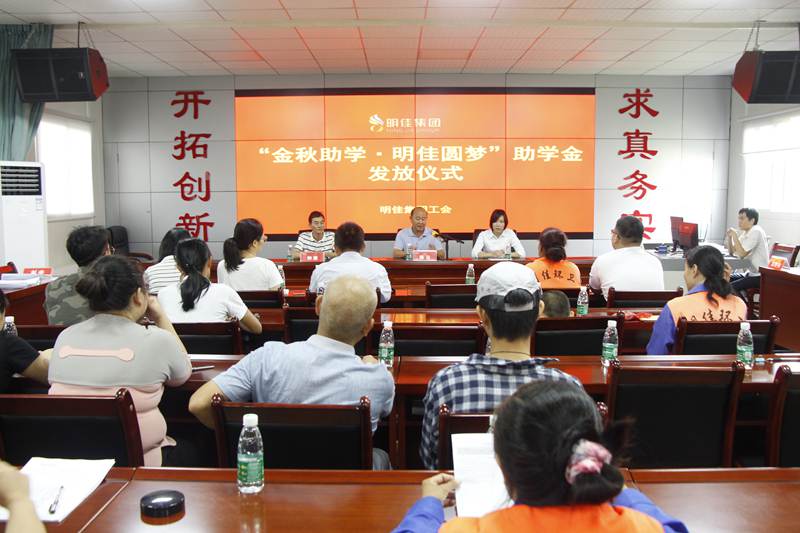 8月28日上午,明佳集團(tuán)工會(huì)“金秋助學(xué)·明佳圓夢(mèng)”助學(xué)金發(fā)放儀式在集團(tuán)公司三樓會(huì)議室舉行,為8個(gè)考取大學(xué)的職工子女發(fā)放助學(xué)金共計(jì)9600元。總裁陳云、副總經(jīng)理鐘寒參加發(fā)放儀式,儀式由工會(huì)主席高斐斐主持。