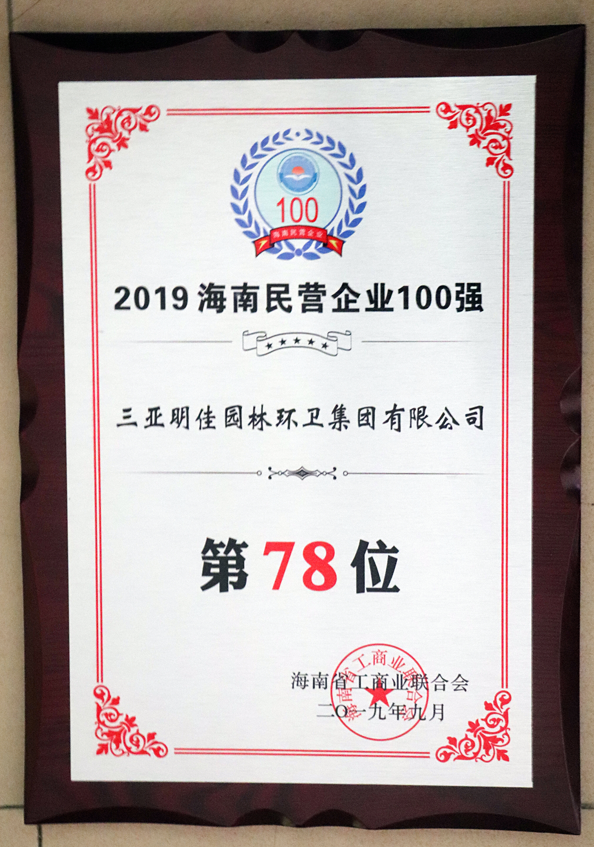 2019海南省民營(yíng)企業(yè)100強(qiáng)證書(shū)