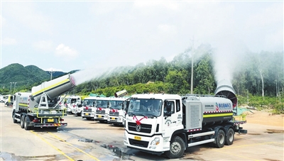 5月9日,三亞新增的21輛新型環(huán)衛(wèi)車同時(shí)亮相,整裝待發(fā)。圖為兩輛多功能抑塵車現(xiàn)場展示噴霧抑塵功能。